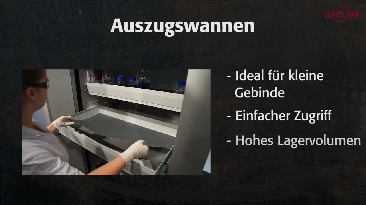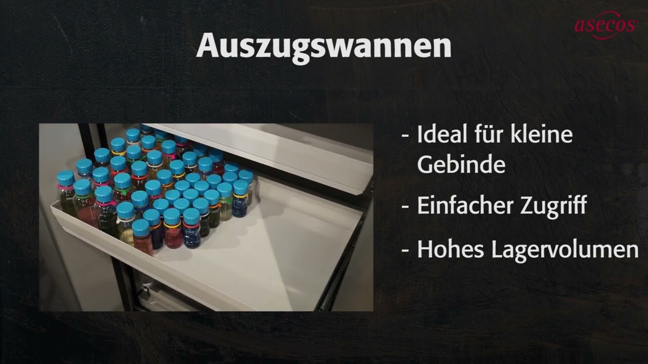 Un raccord d’évacuation d’air d’un diamètre nominal de 75 dans la zone du toit permet le raccordement à un système de ventilation technique. Cela permet d’éliminer efficacement les fumées potentiellement dangereuses. À l’intérieur de l’armoire, des tablettes réglables en hauteur assurent une utilisation flexible de l’espace de rangement. Un bac de rétention au sol avec plaque en tôle perforée conforme à StawaR augmente encore la sécurité de fonctionnement.