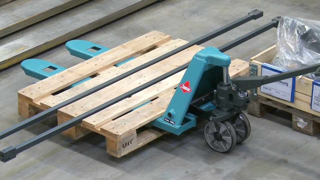 Met de 4-weg handtranspallet van Ameise® breidt u uw actieradius uit en bent u nog flexibeler. Profiteer vooral van een eenvoudig gebruik van de 4-weg Ameise® tijdens het transporteren van een erg brede of lange lading, met name in krappe omstandigheden. Om de transpallet dwars te laten rijden, wordt deze tot een hoogte van ca. 180 mm geheven (ca. 8 keer pompen), zodat de dwarswielen uit de vorkpunt contact maken. Vervolgens kunt u de transpallet makkelijk zijdelings duwen of trekken, wanneer u de dissel 90° draait en met een kleine hendel fixeert. Bij gebruik van de transpallet in dwarsrichting neemt de capaciteit van 2500 kg af tot maximaal 1500 kg.
