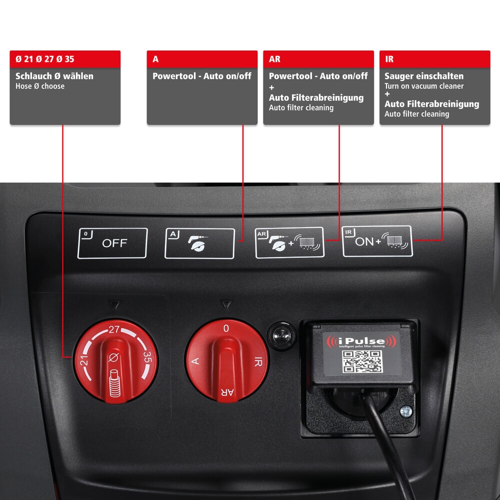 De geïntegreerde iPulse filterreinigingsfunctie zorgt ervoor dat er altijd een constante, grote luchtstroom beschikbaar is. Het verschil in druk wordt continu gemeten om de filterprestatie te bewaken. Indien nodig wordt de elektromagnetische filterreiniging (met een kracht van 300g) geactiveerd. Daarmee kan zelfs het hardnekkigste stof (bijv. gipsstof) uit de filterelementen worden verwijderd.