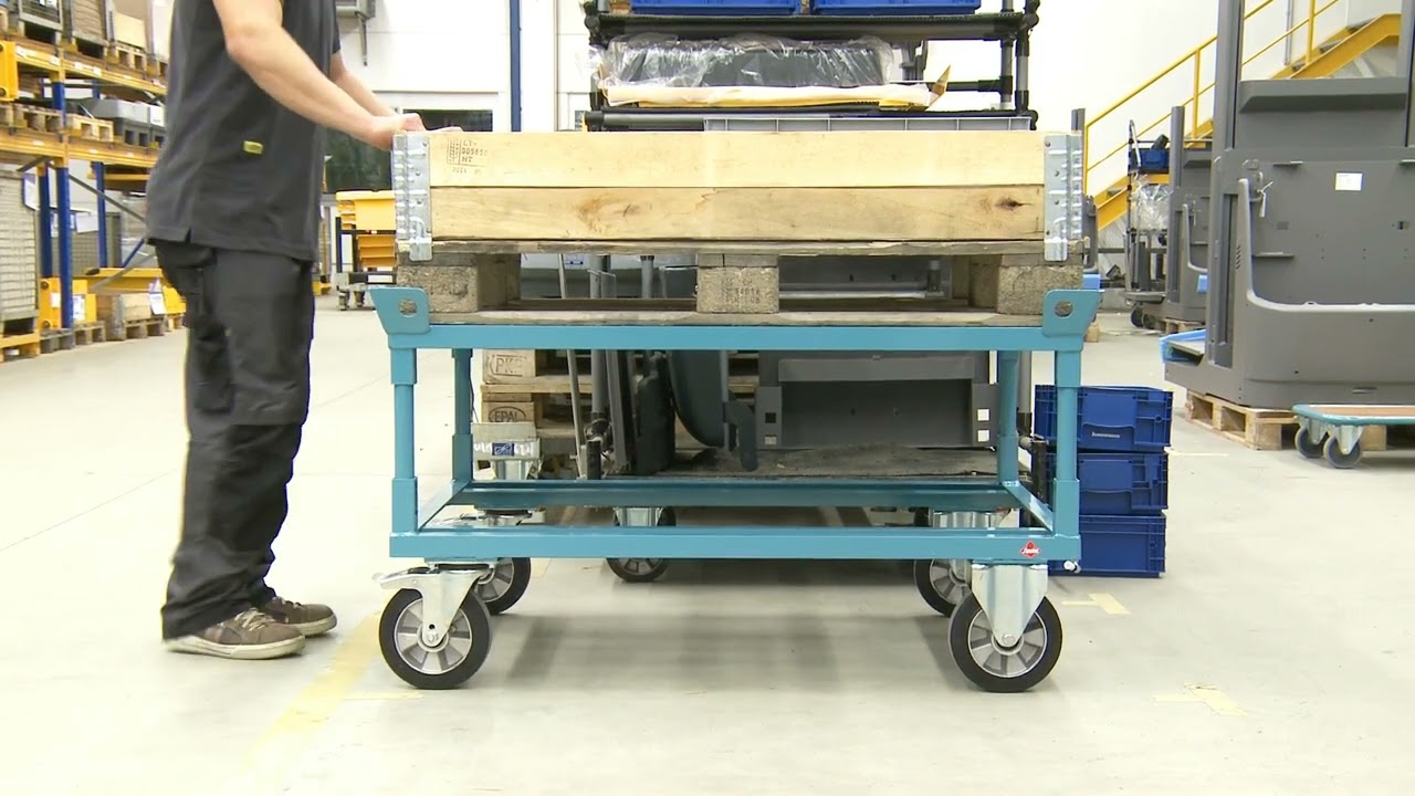 Maak het verplaatsen van uw goederen eenvoudiger met de palletonderwagen Ameise®, met vanghoeken, laadhoogte 650 mm. Koop de onderwagen hier in onze shop.