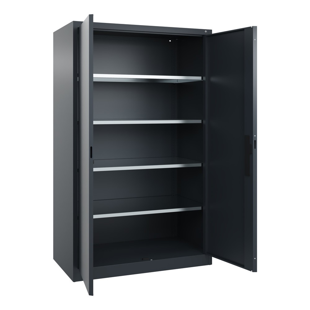 De deuren met centrale versteviging draaien op scharnierpennen en hebben een openingshoek van 110°. Een ergonomische handgreep staat garant voor comfortabel openen en sluiten. Om de inhoud van de kast te beveiligen tegen toegang door onbevoegden, zijn de deuren voorzien van een stevig grendelsysteem.